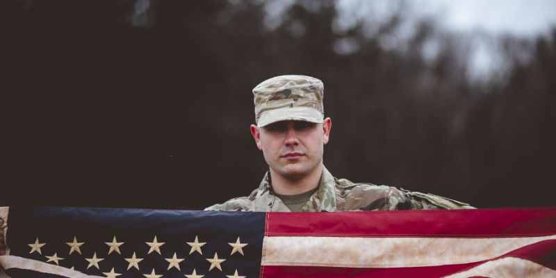 A shallow focus shot of an American soldier holding the American flag